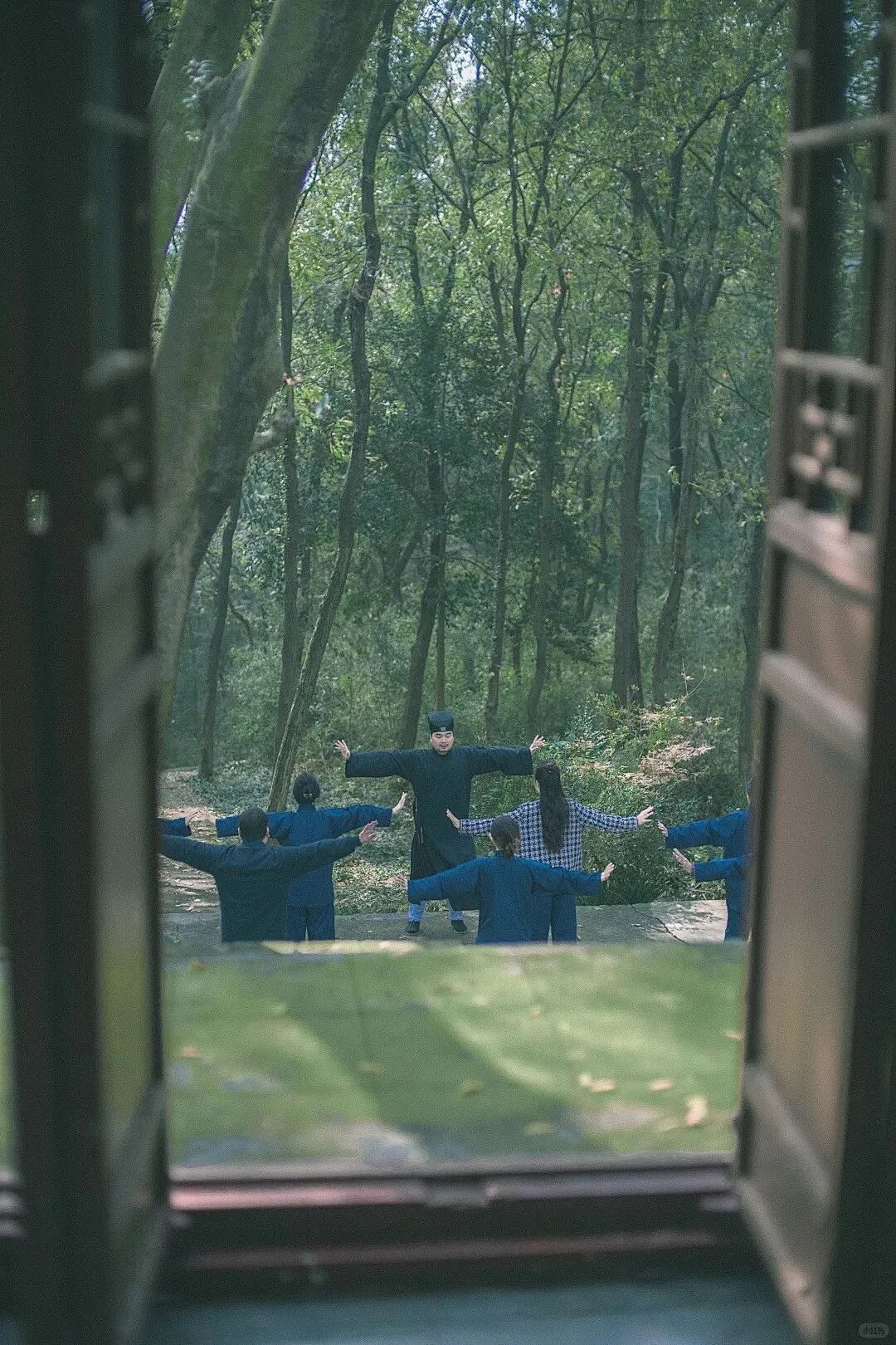 在竹林晨光间一同舒展筋骨