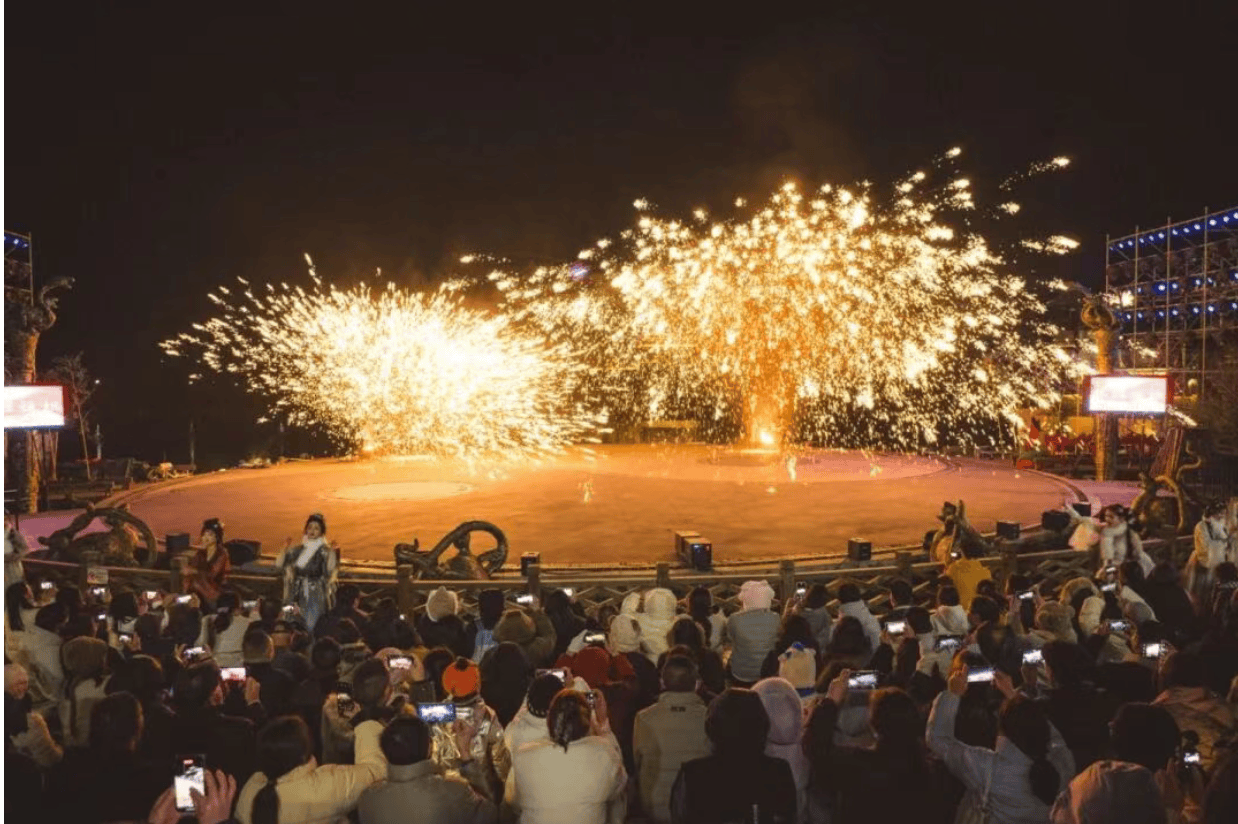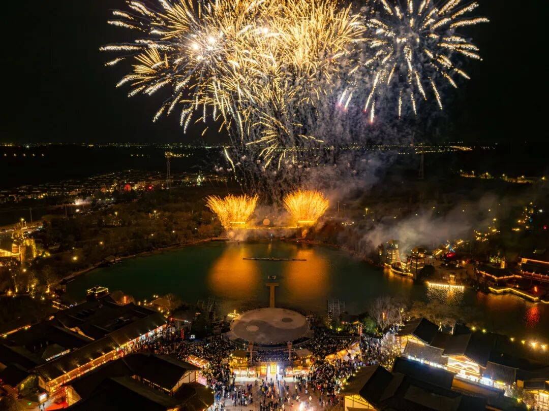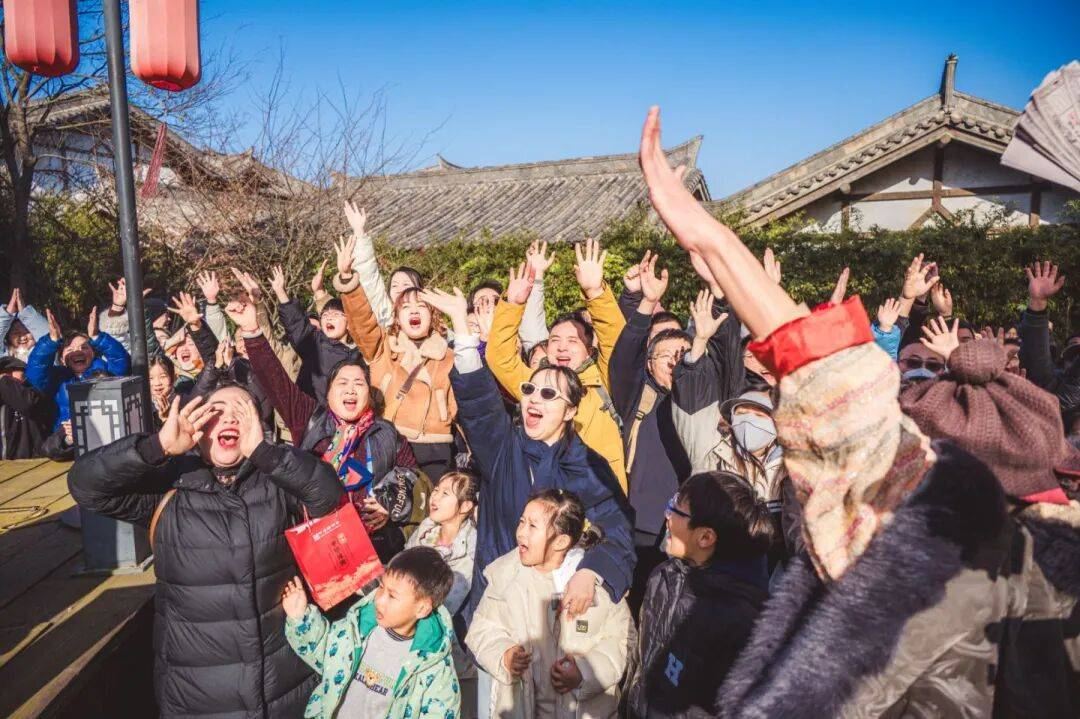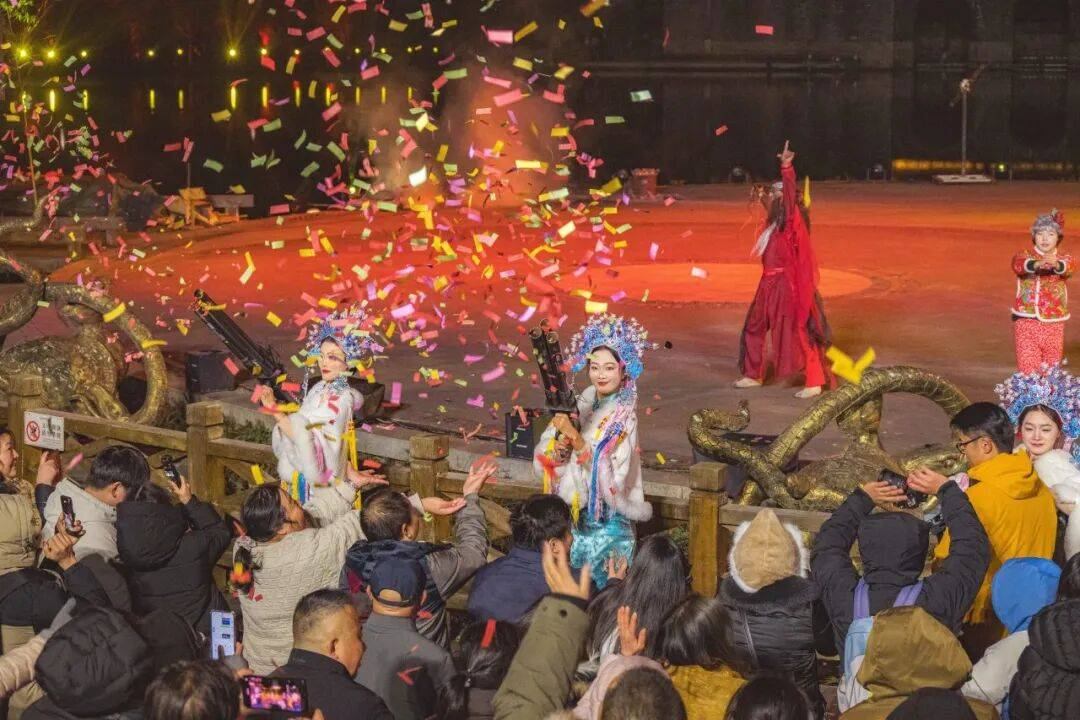 夜间水灯会流光溢彩,非遗火秀轮番登场,营造浓厚节日氛围。还有财神巡礼红包雨,为游客送上元旦祝福,打造兼具跨年仪式感与元旦喜庆感的游玩体验,游客玩得不亦乐乎。