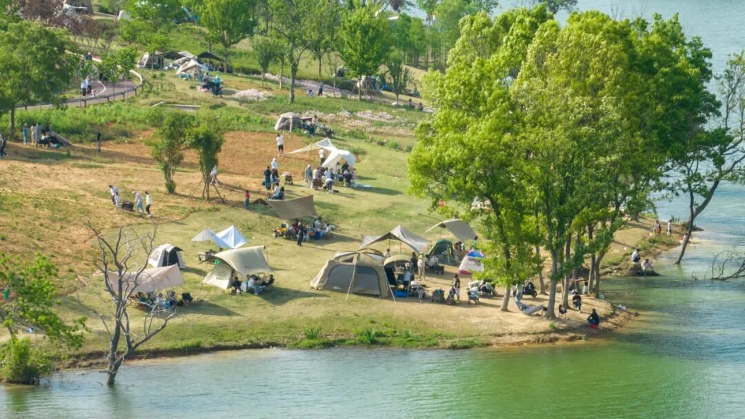 新浮水库畔,水波潋滟与秋日山色相映成趣,成为露营爱好者的新宠。游客在此支起帐篷,沐浴秋风,还可体验桨板,尽享自然之趣。