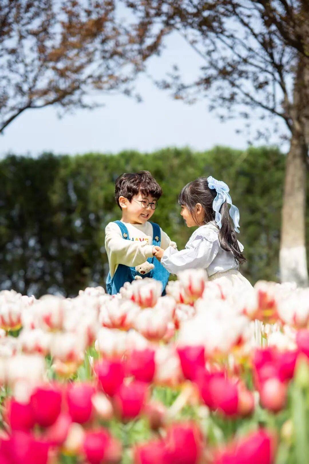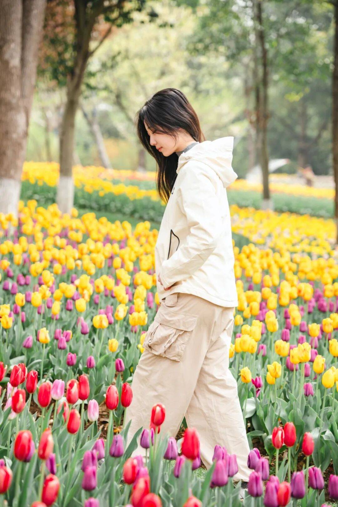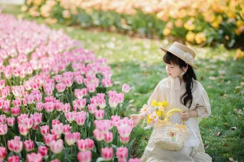 身旁是盛放的郁金香,